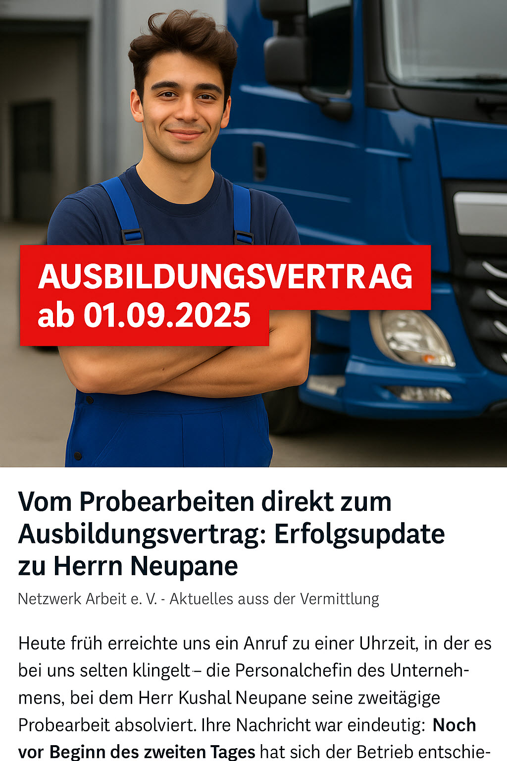 Netzwerk Arbeit e. V. · Aktuelles aus der Vermittlung Heute frĂĽh erreichte uns ein Anruf zu einer Uhrzeit, in der es bei uns selten klingelt – die Personalchefin des Unternehmens, bei dem Herr Kushal Neupane seine zweitägige Probearbeit absolviert. Ihre Nachricht war eindeutig: Noch vor Beginn des zweiten Tages hat…